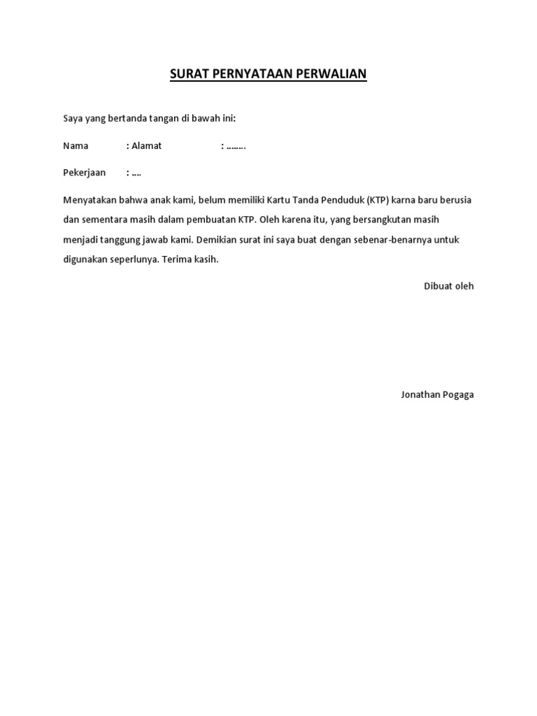 Pada kesempatan kali ini saya akan menjelaskan mengenai beberapa contoh dari surat pernyataan. Seperti surat pernyataan kerja bermaterai, perjanjian, dan pernyataan belum menikah. Berisi contoh surat pernyataan lengkap dengan formatnya. Contoh surat pernyataan terbaru dilengkapi dengan contoh terbaru dan cara membuatnya. Maka kesimpulan perwalian menurut beberapa ahli adalah orang yang dinyatakan belum dewasa maka diwalikan oleh walinya ketika. Tujuan & manfaat dari surat pernyataan adalah sebagai penjamin kepastian hokum. Adalah istri gede putra nendrawan (almarhum) sekaligus wali dari: Surat pernyataan hak wali asuh anak. Surat pernyataan merupakan salah satu surat yang umum digunakan untuk berbagai macam hal. 1 tahun 1974 tentang perkawinan (uu perkawinan) mengatur f) surat keterangan ahli waris dari lurah/kepala desa setempat. Contoh surat pernyataan adalah surat yang digunakan untuk menyatakan sesuatu kepada penerima. Meskipun hal yang dicantumkan dalam surat pernyataan bisa saja sederhana, tapi banyak orang yang masih tidak tahu, bagaimana cara membuat surat pernyataan? Semua contoh ini ada karena kebutuhan akan surat ini memang besar.